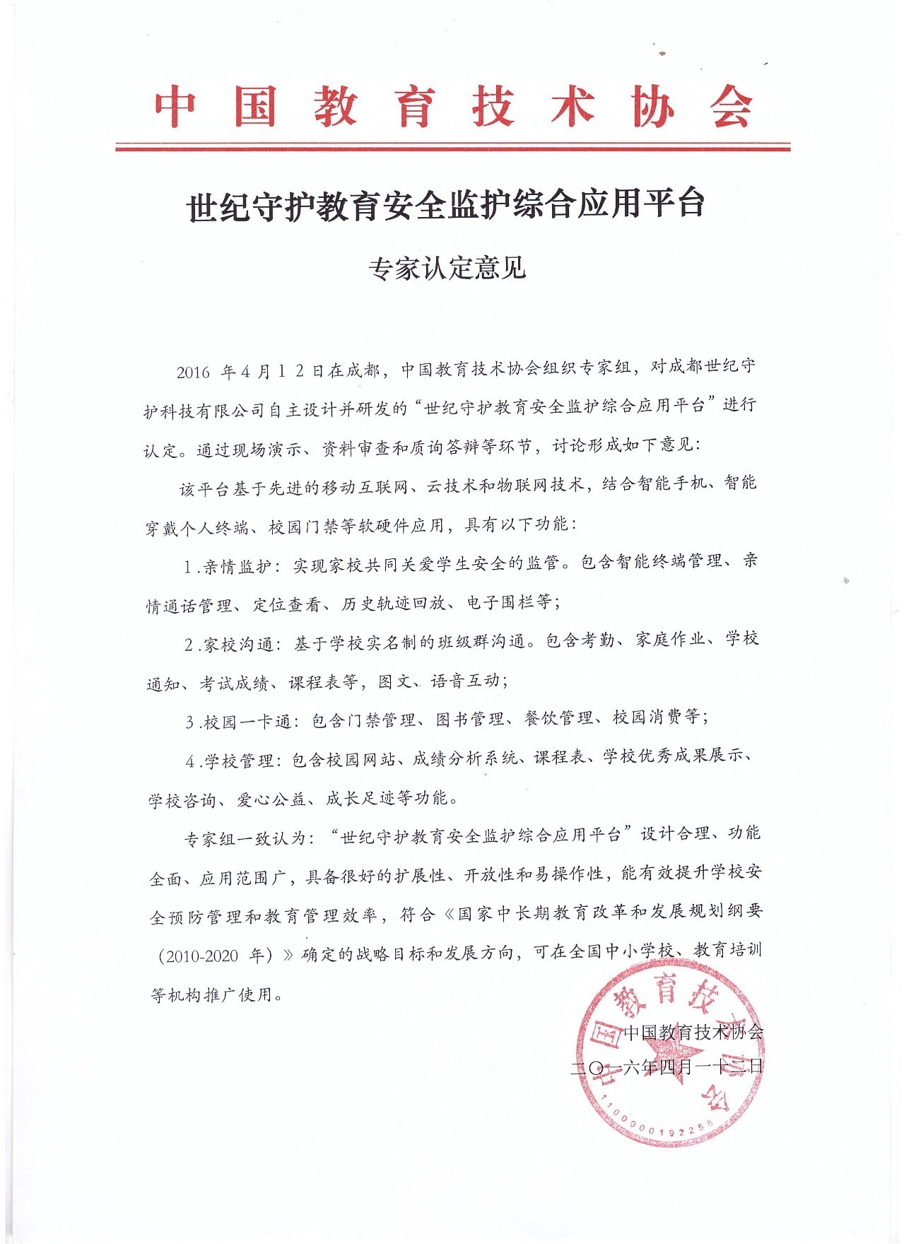 “世紀守護”在2016年4月份獲得中國教育技術協(xié)會的權威認定,肯定了其在全國中小學校和教育培訓機構的推廣和應用價值。